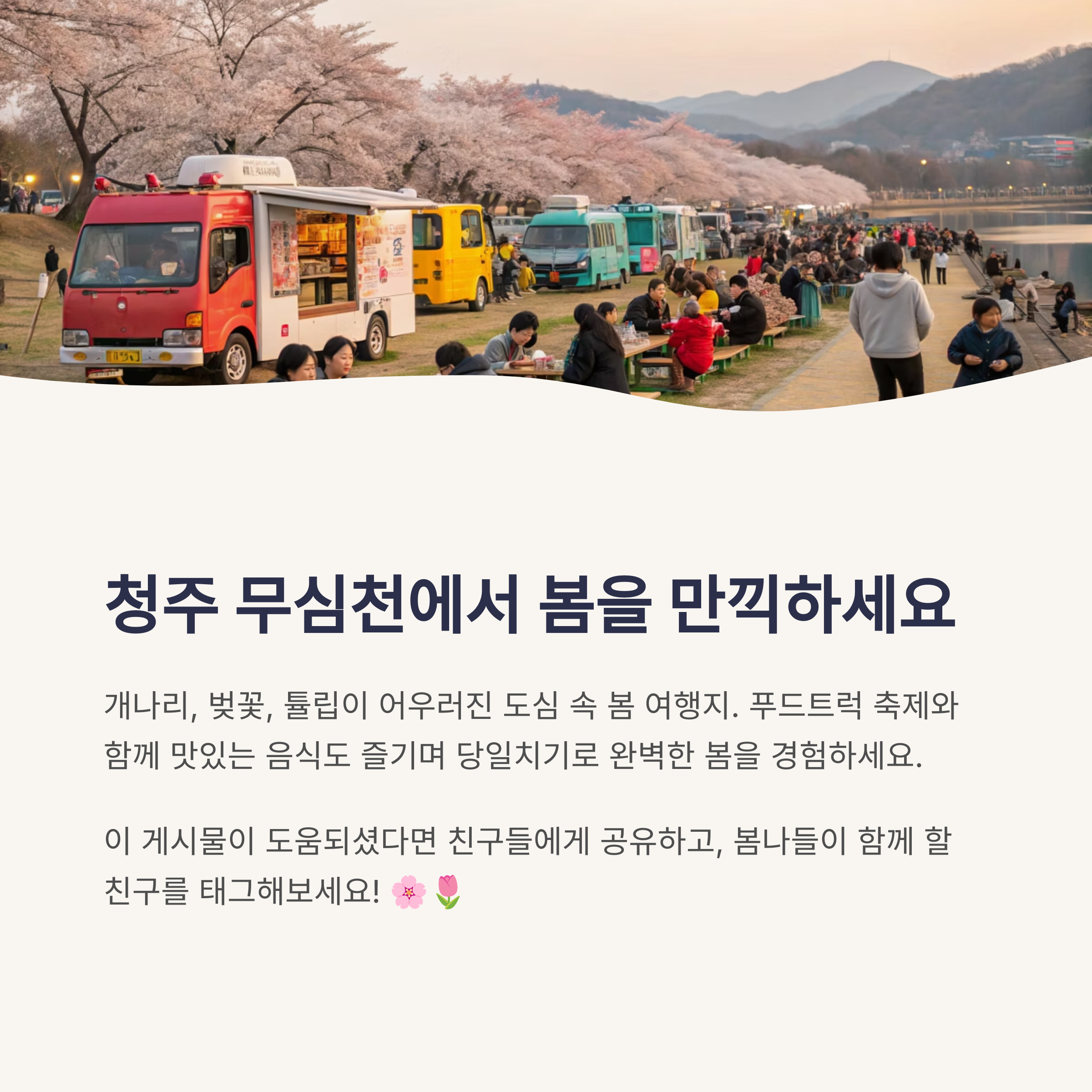 바로 충청북도 청주에 위치한 무심천인데요. 이곳은 벚꽃과 튤립으로 유명한 봄철 여행지로, 많은 분들이 사랑하는 명소랍니다. 함께 청주 무심천의 매력을 알아보러 가볼까요?