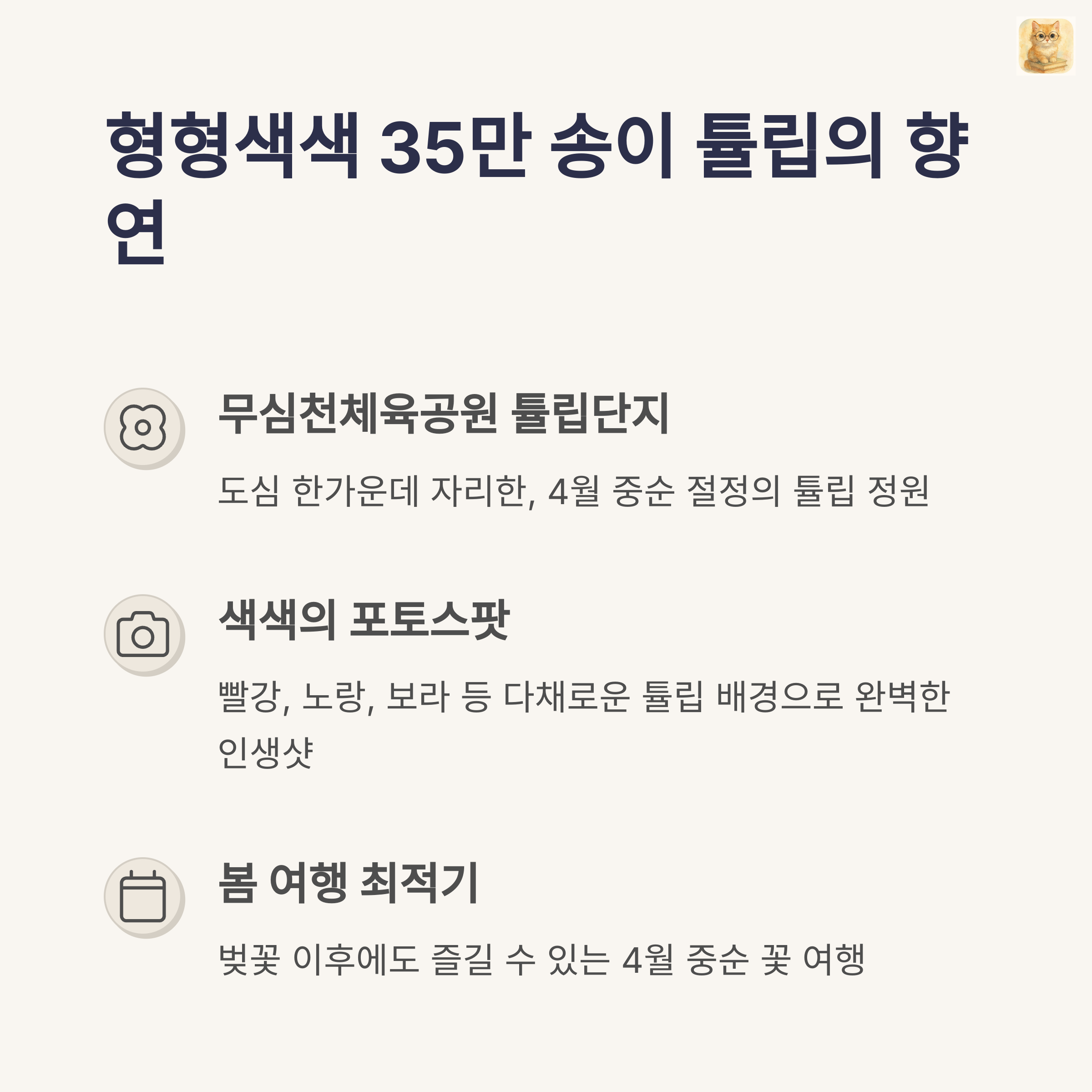 튤립의 화려한 색감과 봄 햇살이 어우러진 풍경은 정말 잊지 못할 경험을 선사할 거예요.
